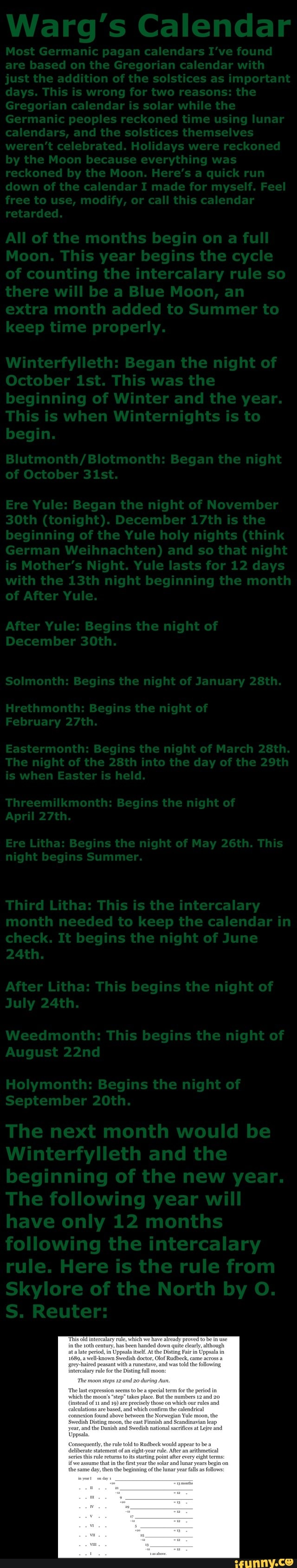 Most Germanic pagan calendars I’ve found are based on the Gregorian calendar with just the addition of the solstices as important days. This is wrong for two reasons: the Gregorian calendar is solar while the Germanic peoples reckoned time using lunar calendars, and the solstices themselves weren’t celebrated. Holidays were reckoned by the Moon because everything was reckoned by the Moon. Here’s a quick run down of the calendar I made for myself. Feel free to use, modify, or call this calendar retarded. All of the months begin on a full Moon. This year begins the cycle of counting the intercalary rule so there will be a Blue Moon, an extra month added to Summer to keep time properly. Winterfylleth: Began the night of October 1st. This was the beginning of Winter and the year. This is when Winternights is to begin. Blutmonth/Blotmonth: Began the night of October 31st. Ere Yule: Began the night of November 30th (tonight). December 17th is the beginning of the Yule holy nights (think German Weihnachten) and so that night is Mother’s Night. Yule lasts for 12 days with the 13th night beginning the month of After Yule. After Yule: Begins the night of December 30th. Solmonth: Begins the night of January 28th. Hrethmonth: Begins the night of February 27th. Eastermonth: Begins the night of March 28th. The night of the 28th into the day of the 29th is when Easter is held. Threemilkmonth: Begins the night of April 27th. Ere Litha: Begins the night of May 26th. This night begins Summer. Third Litha: This is the intercalary month needed to keep the calendar in check. It begins the night of June 24th. After Litha: This begins the night of July 24th. Weedmonth: This begins the night of August 22nd Holymonth: Begins the night of September 20th. The next month would be Winterfylleth and the beginning of the new year. The following year will have only 12 months following the intercalary rule. Here is the rule from Skylore of the North by O. S. Reuter: