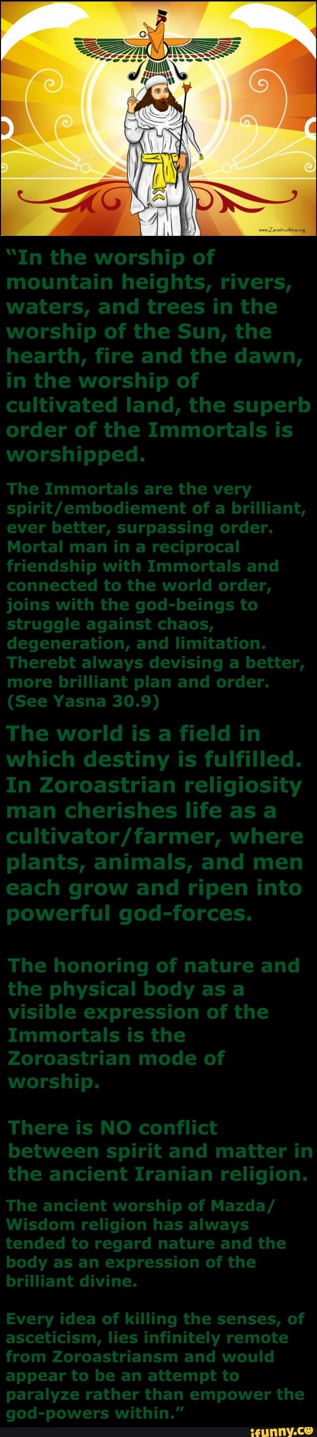 “In the worship of mountain heights, rivers, waters, and trees in the worship of the Sun, the hearth, fire and the dawn, in the worship of cultivated land, the superb order of the Immortals is worshipped. The Immortals are the very spirit/embodiement of a brilliant, ever better, surpassing order. Mortal man in a reciprocal friendship with Immortals and connected to the world order, joins with the god-beings to struggle against chaos, degeneration, and limitation. Therebt always devising a better, more brilliant plan and order. (See Yasna 30.9) The world is a field in which destiny is fulfilled. In Zoroastrian religiosity man cherishes life as a cultivator/farmer, where plants, animals, and men each grow and ripen into powerful god-forces. The honoring of nature and the physical body as a visible expression of the Immortals is the Zoroastrian mode of worship. There is NO conflict between spirit and matter in the ancient Iranian religion. The ancient worship of Mazda/ Wisdom religion has always tended to regard nature and the body as an expression of the brilliant divine. Every idea of killing the senses, of asceticism, lies infinitely remote from Zoroastriansm and would appear to be an attempt to paralyze rather than empower the god-powers within.”