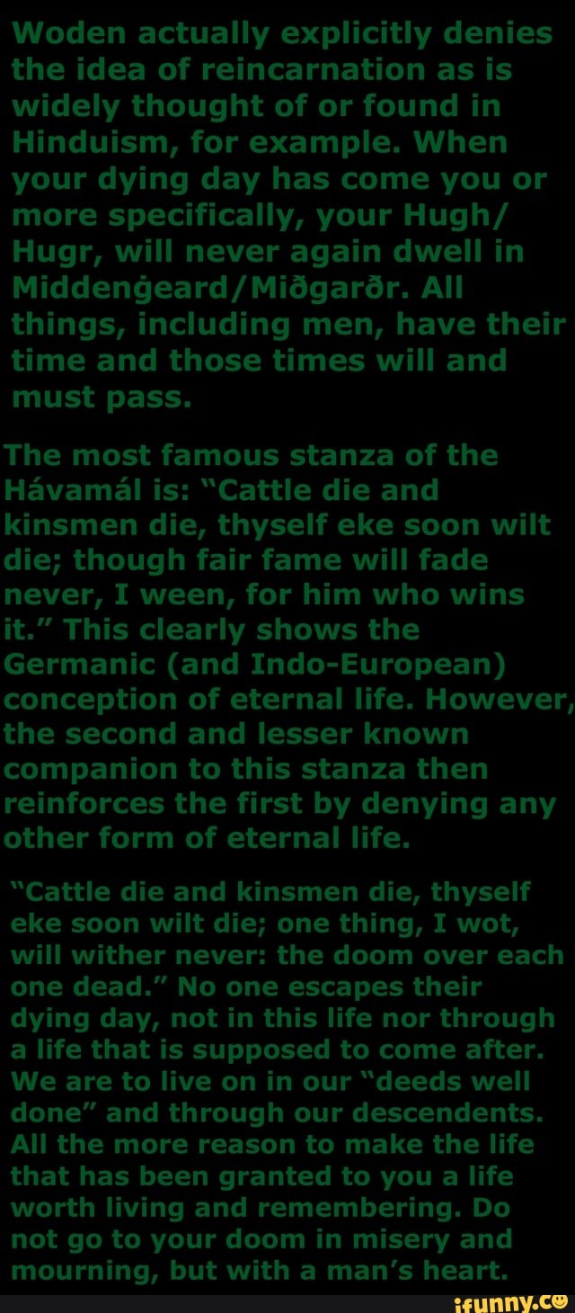 Woden actually explicitly denies the idea of reincarnation as is widely thought of or found in Hinduism, for example. When your dying day has come you or more specifically, your Hugh/ Hugr, will never again dwell in Middengeard/Miðgarðr. All things, including men, have their time and those times will and must pass. The most famous stanza of the Hávamál is: “Cattle die and kinsmen die, thyself eke soon wilt die; though fair fame will fade never, I ween, for him who wins it.” This clearly shows the Germanic (and Indo-European) conception of eternal life. However, the second and lesser known companion to this stanza then reinforces the first by denying any other form of eternal life. “Cattle die and kinsmen die, thyself eke soon wilt die; one thing, I wot, will wither never: the doom over each one dead.” No one escapes their dying day, not in this life nor through a life that is supposed to come after. We are to live on in our “deeds well done” and through our descendents. All the more reason to make the life that has been granted to you a life worth living and remembering. Do not go to your doom in misery and mourning, but with a man’s heart.