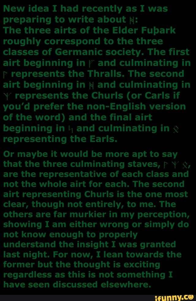 New idea I had recently as I was preparing to write about N: The three airts of the Elder Fuþark roughly correspond to the three classes of Germanic society. The first airt beginning in and culminating in P represents the Thralls. The second airt beginning in N and culminating in Y represents the Churls (or Carls if you’d prefer the non-English version of the word) and the final airt beginning in 4 and culminating in representing the Earls. Or maybe it would be more apt to say that the three culminating staves, PYr are the representative of each class and not the whole airt for each. The second airt representing Churls is the one most clear, though not entirely, to me. The others are far murkier in my perception, showing I am either wrong or simply do not know enough to properly understand the insight I was granted last night. For now, I lean towards the former but the thought is exciting regardless as this is not something I have seen discussed elsewhere.
