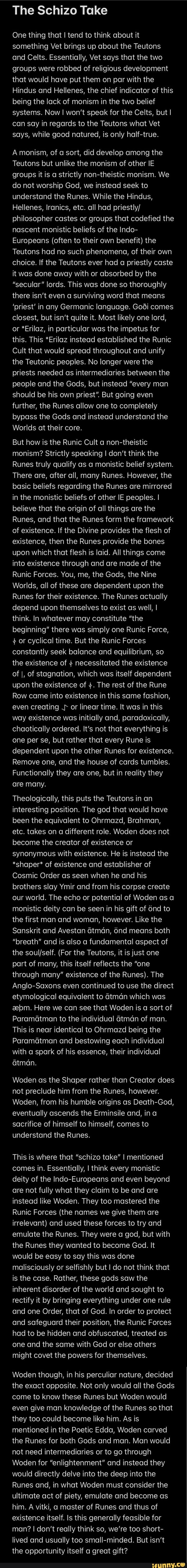 One thing that I tend to think about it something Vet brings up about the Teutons and Celts. Essentially, Vet says that the two groups were robbed of religious development that would have put them on par with the Hindus and Hellenes, the chief indicator of this being the lack of monism in the two belief systems. Now I won’t speak for the Celts, but I can say in regards to the Teutons what Vet says, while good natured, is only half-true. A monism, of a sort, did develop among the Teutons but unlike the monism of other IE groups it is a strictly non-theistic monism. We do not worship God, we instead seek to understand the Runes. While the Hindus, Hellenes, Iranics, etc. all had priestly/ philosopher castes or groups that codefied the nascent monistic beliefs of the Indo- Europeans (often to their own benefit) the Teutons had no such phenomena, of their own choice. If the Teutons ever had a priestly caste it was done away with or absorbed by the “secular” lords. This was done so thoroughly there isn’t even a surviving word that means ‘priest’ in any Germanic language. Gooi comes closest, but isn’t quite it. Most likely one lord, or *Erilaz, in particular was the impetus for this. This *Erilaz instead established the Runic Cult that would spread throughout and unify the Teutonic peoples. No longer were the priests needed as intermediaries between the people and the Gods, but instead “every man should be his own priest”. But going even further, the Runes allow one to completely bypass the Gods and instead understand the Worlds at their core. But how is the Runic Cult a non-theistic monism? Strictly speaking I don’t think the Runes truly qualify as a monistic belief system. There are, after all, many Runes. However, the basic beliefs regarding the Runes are mirrored in the monistic beliefs of other IE peoples. I believe that the origin of all things are the Runes, and that the Runes form the framework of existence. If the Divine provides the flesh of existence, then the Runes provide the bones upon which that flesh is laid. All things come into existence through and are made of the Runic Forces. You, me, the Gods, the Nine Worlds, all of these are dependent upon the Runes for their existence. The Runes actually depend upon themselves to exist as well, I think. In whatever may constitute “the beginning” there was simply one Runic Force, or cyclical time. But the Runic Forces constantly seek balance and equilibrium, so the existence of necessitated the existence of I, of stagnation, which was itself dependent upon the existence of . The rest of the Rune Row came into existence in this same fashion, even creating or linear time. It was in this way existence was initially and, paradoxically, chaotically ordered. It’s not that everything is one per se, but rather that every Rune is dependent upon the other Runes for existence. Remove one, and the house of cards tumbles. Functionally they are one, but in reality they are many. Theologically, this puts the Teutons in an interesting position. The god that would have been the equivalent to Ohrmazd, Brahman, etc. takes on a different role. Woden does not become the creator of existence or synonymous with existence. He is instead the *shaper* of existence and establisher of Cosmic Order as seen when he and his brothers slay Ymir and from his corpse create our world. The echo or potential of Woden as a monistic deity can be seen in his gift of önd to the first man and woman, however. Like the Sanskrit and Avestan ātmán, önd means both “breath” and is also a fundamental aspect of the soul/self. (For the Teutons, it is just one part of many, this itself reflects the “one through many” existence of the Runes). The Anglo-Saxons even continued to use the direct etymological equivalent to ātmán which was æpm. Here we can see that Woden is a sort of Paramātman to the individual ātmán of man. This is near identical to Ohrmazd being the Paramātman and bestowing each individual with a spark of his essence, their individual ātmán. Woden as the Shaper rather than Creator does not preclude him from the Runes, however. Woden, from his humble origins as Death-God, eventually ascends the Erminsile and, in a sacrifice of himself to himself, comes to understand the Runes. This is where that “schizo take” I mentioned comes in. Essentially, I think every monistic deity of the Indo-Europeans and even beyond are not fully what they claim to be and are instead like Woden. They too mastered the Runic Forces (the names we give them are irrelevant) and used these forces to try and emulate the Runes. They were a god, but with the Runes they wanted to become God. It would be easy to say this was done malisciously or selfishly but I do not think that is the case. Rather, these gods saw the inherent disorder of the world and sought to rectify it by bringing everything under one rule and one Order, that of God. In order to protect and safeguard their position, the Runic Forces had to be hidden and obfuscated, treated as one and the same with God or else others might covet the powers for themselves. Woden though, in his perculiar nature, decided the exact opposite. Not only would all the Gods come to know these Runes but Woden would even give man knowledge of the Runes so that they too could become like him. As is mentioned in the Poetic Edda, Woden carved the Runes for both Gods and man. Man would not need intermediaries or to go through Woden for “enlightenment” and instead they would directly delve into the deep into the Runes and, in what Woden must consider the ultimate act of piety, emulate and become as him. A vitki, a master of Runes and thus of existence itself. Is this generally feasible for man? I don’t really think so, we’re too short- lived and usually too small-minded. But isn’t the opportunity itself a great gift?