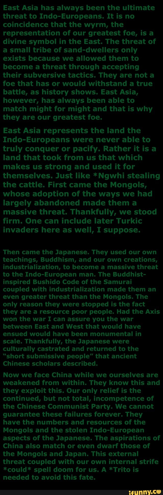 East Asia has always been the ultimate threat to Indo-Europeans. It is no coincidence that the Wyrm, the representation of our greatest foe, is a divine symbol in the East. The threat of a small tribe of sand-dwellers only exists because we allowed them to become a threat through accepting their subversive tactics. They are not a foe that has or would withstand a true battle, as history shows. East Asia, however, has always been able to match might for might and that is why they are our greatest foe. East Asia represents the land the Indo-Europeans were never able to truly conquer or pacify. Rather it is a land that took from us that which makes us strong and used it for themselves. Just like *Ngwhi stealing the cattle. First came the Mongols, whose adoption of the ways we had largely abandoned made them a massive threat. Thankfully, we stood firm. One can include later Turkic invaders here as well, I suppose. Then came the Japanese. They used our own teachings, Buddhism, and our own creations, industrialization, to become a massive threat to the Indo-European man. The Buddhist- inspired Bushido Code of the Samurai coupled with industrialization made them an even greater threat than the Mongols. The only reason they were stopped is the fact they are a resource poor people. Had the Axis won the war I can assure you the war between East and West that would have ensued would have been monumental in scale. Thankfully, the Japanese were culturally castrated and returned to the “short submissive people” that ancient Chinese scholars described. Now we face China while we ourselves are weakened from within. They know this and they exploit this. Our only relief is the continued, but not total, incompetence of the Chinese Communist Party. We cannot guarantee these failures forever. They have the numbers and resources of the Mongols and the stolen Indo-European aspects of the Japanese. The aspirations of China also match or even dwarf those of the Mongols and Japan. This external threat coupled with our own internal strife *could* spell doom for us. A *Trito is needed to avoid this fate.