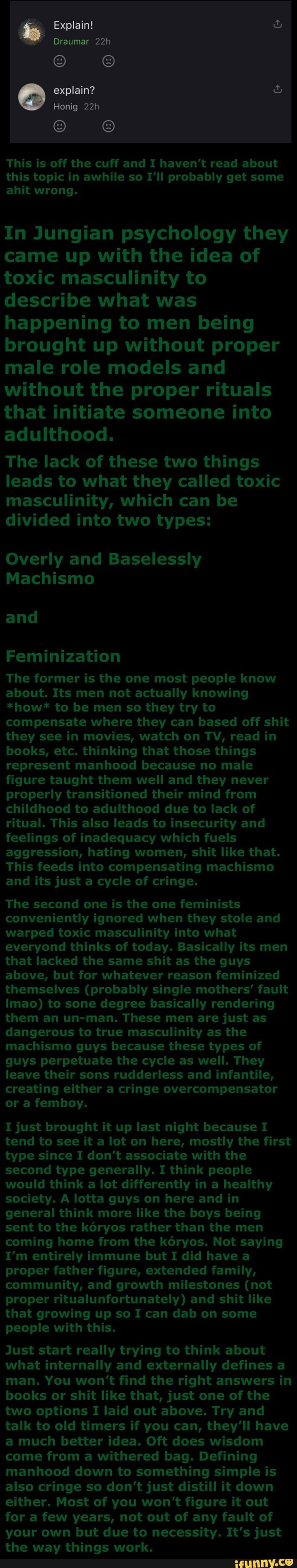 This is off the cuff and I haven’t read about this topic in awhile so I’ll probably get some shit wrong. In Jungian psychology they came up with the idea of toxic masculinity to describe what was happening to men being brought up without proper male role models and without the proper rituals that initiate someone into adulthood. The lack of these two things leads to what they called toxic masculinity, which can be divided into two types: Overly and Baselessly Machismo and Feminization The former is the one most people know about. Its men not actually knowing *how* to be men so they try to compensate where they can based off shit they see in movies, watch on TV, read in books, etc. thinking that those things represent manhood because no male figure taught them well and they never properly transitioned their mind from childhood to adulthood due to lack of ritual. This also leads to insecurity and feelings of inadequacy which fuels aggression, hating women, shit like that. This feeds into compensating machismo and its just a cycle of cringe. The second one is the one feminists conveniently ignored when they stole and warped toxic masculinity into what everyond thinks of today. Basically its men that lacked the same shit as the guys above, but for whatever reason feminized themselves (probably single mothers’ fault Imao) to sone degree basically rendering them an un-man. These men are just as dangerous to true masculinity as the machismo guys because these types of guys perpetuate the cycle as well. They leave their sons rudderless and infantile, creating either a cringe overcompensator or a femboy. I just brought it up last night because I tend to see it a lot on here, mostly the first type since I don’t associate with the second type generally. I think people would think a lot differently in a healthy society. A lotta guys on here and in general think more like the boys being sent to the kóryos rather than the men coming home from the kóryos. Not saying I’m entirely immune but I did have a proper father figure, extended family, community, and growth milestones (not proper ritualunfortunately) and shit like that growing up so I can dab on some people with this. Just start really trying to think about what internally and externally defines a man. You won’t find the right answers in books or shit like that, just one of the two options I laid out above. Try and talk to old timers if you can, they’ll have a much better idea. Oft does wisdom come from a withered bag. Defining manhood down to something simple is also cringe so don’t just distill it down either. Most of you won’t figure it out for a few years, not out of any fault of your own but due to necessity. It’s just the way things work.