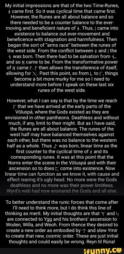 My initial impressions are that of the two Time-Runes, came first. So it was cyclical time that came first. However, the Runes are all about balance and so there needed to be a counter balance to the ever- moving and beneficient nature of +. Thus, I came into existence to balance out ever-movement and beneficence with stagnation and harmfulness. Then began the sort of “arms race” between the runes of the west side. From the conflict between + and | the was born. Then there had to be salvation from +, and so N came to be. From the transformative power of N came P. P then allows the transference of itself, allowing for X. Past this point, so from to, things become a bit more murky for me so I need to understand more before I speak on these last six runes of the west side. However, what I can say is that by the time we reach that we have arrived at the early parts of the Völuspá, where the Gods existed as they are envisioned in other pantheons. Deathless and without much, if any, limit to their might. But as I have said, the Runes are all about balance. The runes of the west half may have balanced themselves against each other, but there was no balance to the western half as a whole. Thus was born, linear time as the first counter to the cyclical time of and its corresponding runes. It was at this point that the Norns enter the scene in the Völuspá and with their ascension so to does come into existence. Now linear time can function as we know it, with cause and effect rearing it’s ugly head. No more were the Gods deathless and no more was their power limitless. Wyrd’s web had now ensnared the Gods and all else. To better understand the runic forces that come after I’ll need to think more, but I do think this line of thinking as merit. My initial thoughts are that Y and are connected to Ygg and his brothers’ ascension to Woden, Willa, and Weoh. From thence they desired to create a new order as embodied by ↑ and slew Ymir to create that new, cosmic order. These are just initial thoughts and could easily be wrong. Reyn til Rúna!