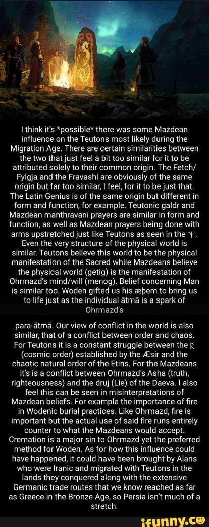 I think it’s *possible* there was some Mazdean influence on the Teutons most likely during the Migration Age. There are certain similarities between the two that just feel a bit too similar for it to be attributed solely to their common origin. The Fetch/ Fylgja and the Fravashi are obviously of the same origin but far too similar, I feel, for it to be just that. The Latin Genius is of the same origin but different in form and function, for example. Teutonic galdr and Mazdean manthravani prayers are similar in form and function, as well as Mazdean prayers being done with arms upstretched just like Teutons as seen in the Y. Even the very structure of the physical world is similar. Teutons believe this world to be the physical manifestation of the Sacred while Mazdeans believe the physical world (getig) is the manifestation of Ohrmazd’s mind/will (menog). Belief concerning Man is similar too. Woden gifted us his æpem to bring us to life just as the individual ātmā is a spark of Ohrmazd’s para-ātmā. Our view of conflict in the world is also similar, that of a conflict between order and chaos. For Teutons it is a constant struggle between the R (cosmic order) established by the Æsir and the chaotic natural order of the Etins. For the Mazdeans it’s is a conflict between Ohrmazd’s Asha (truth, righteousness) and the druj (Lie) of the Daeva. I also feel this can be seen in misinterpretations of Mazdean beliefs. For example the importance of fire in Wodenic burial practices. Like Ohrmazd, fire is important but the actual use of said fire runs entirely counter to what the Mazdeans would accept. Cremation is a major sin to Ohrmazd yet the preferred method for Woden. As for how this influence could have happened, it could have been brought by Alans who were Iranic and migrated with Teutons in the lands they conquered along with the extensive Germanic trade routes that we know reached as far as Greece in the Bronze Age, so Persia isn’t much of a stretch.
